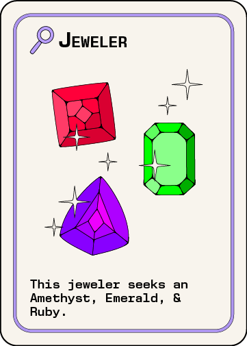 Card Backs: purple palette split by deck: a darker shade for the Gem Deck (primary) and a lighter, desaturated variation for the Jeweler Deck (smaller, ~9 cards). The contrast improves gameplay flow and organization