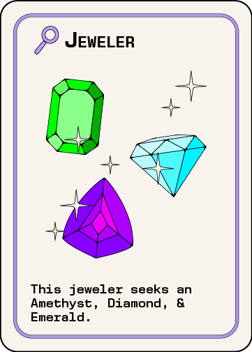 Deck Backs: Dark purple (Gem Deck) and a lighter, desaturated purple (Jeweler Deck) for instant recognition and smoother gameplay organization